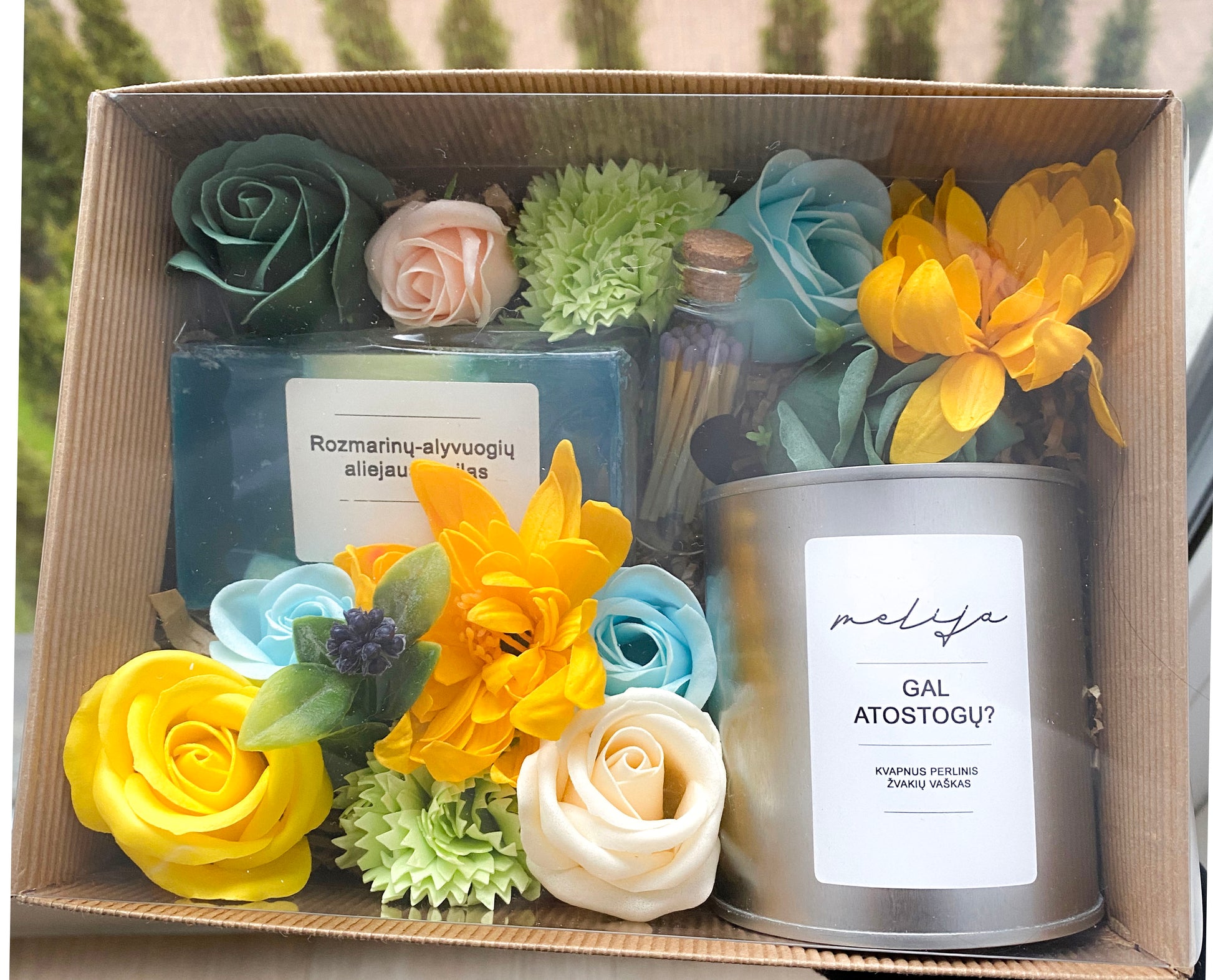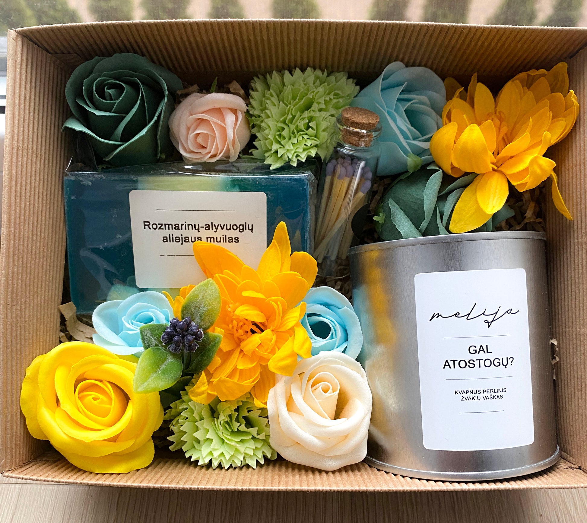 Rozmarinų–alyvuogių aliejaus muilas ir ryškios muilo gėlės suteikia rinkiniui energijos ir spalvingumo.
